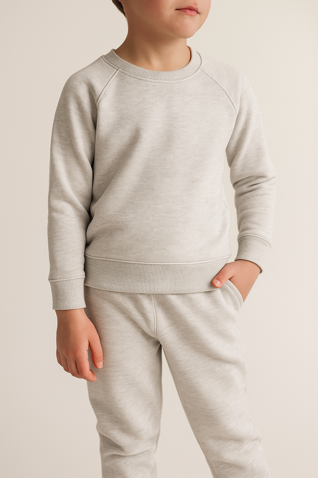 Crafted from 300 GSM brushed fleece, this set offers superior softness on the inside and a structured, clean look on the outside. The crewneck sweatshirt delivers a timeless silhouette, while the matching joggers provide flexibility and durability for active kids.