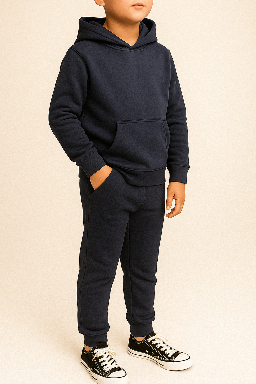 The Drip Hatch Kids Hooded Fleece Tracksuit is crafted for active kids who love to move. Its 300 GSM fabric offers insulation for colder days without sacrificing breathability — ideal for indoor wear, outdoor play, or school uniforms. This set’s clean finish and durable design make it a top choice for retail customers and wholesale distributors alike.
